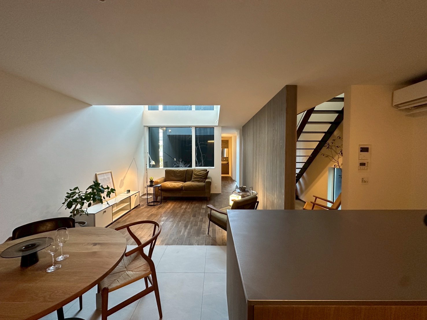 吹抜けの窓からのぞく中庭は、暮らしの背景そのものに。